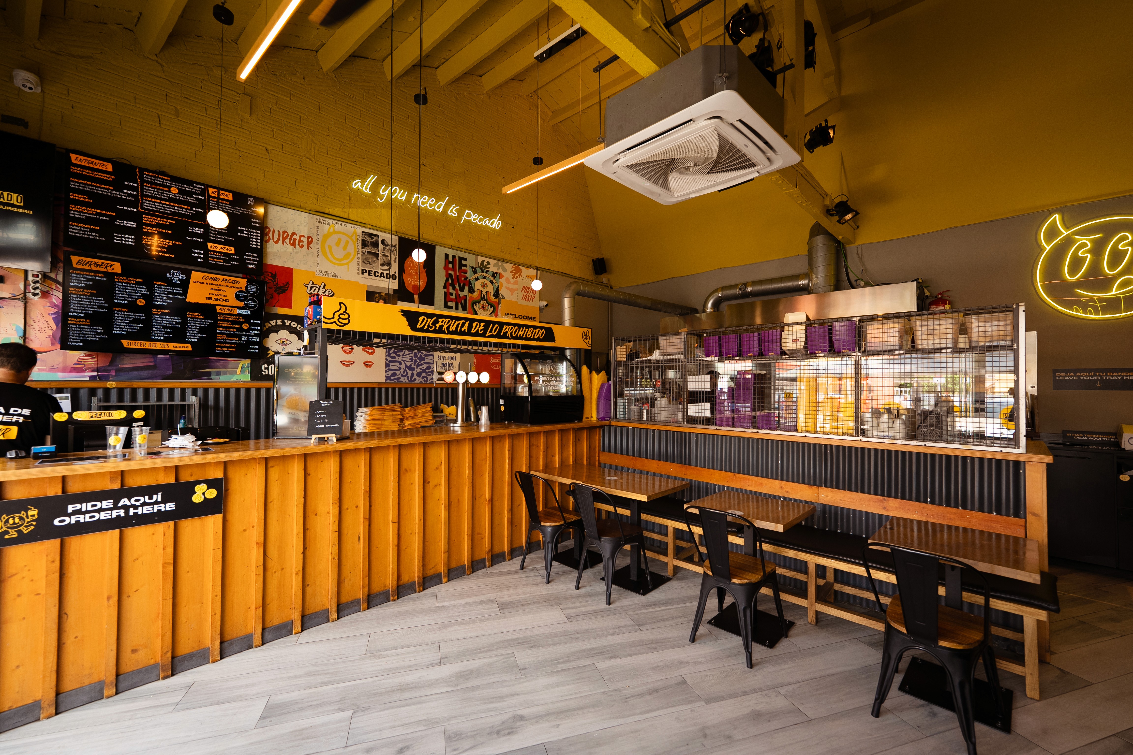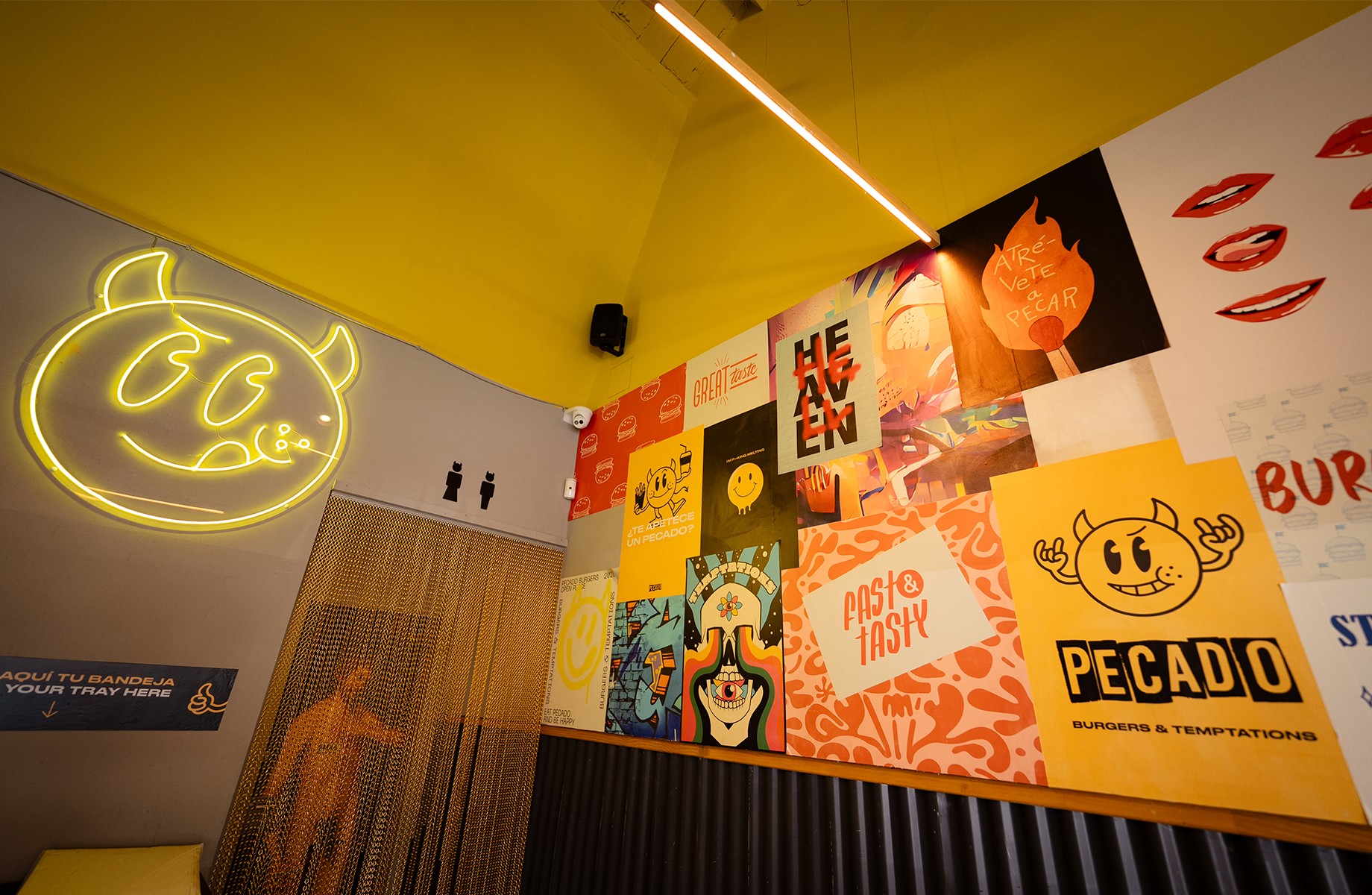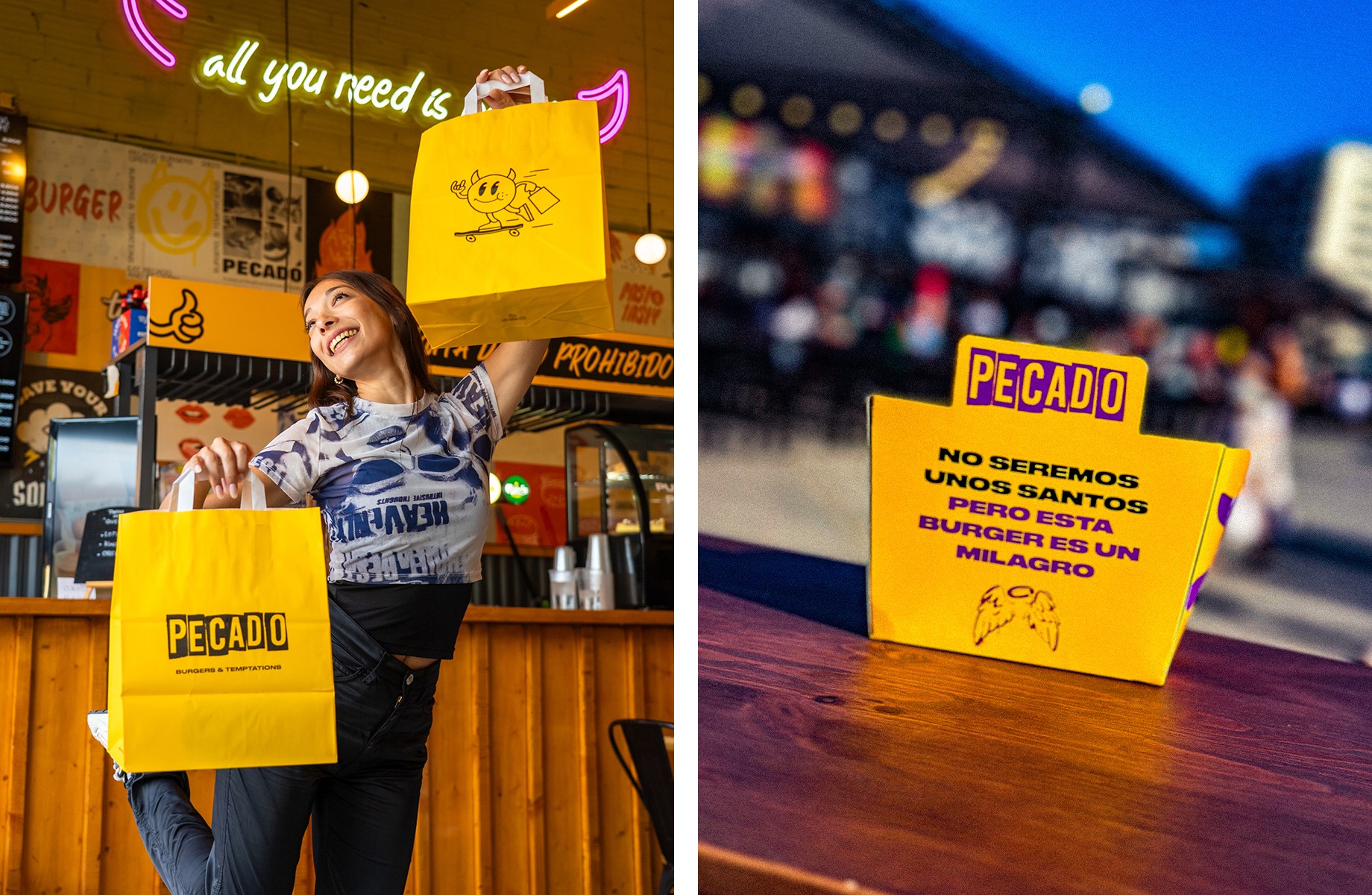 Branding integral desde cero para Pecado Burgers, una hamburguesería con carácter propio. Construcción de la identidad visual y verbal: logotipo, tono de comunicación, packaging, carta, rótulo y gráficas interiores. Una marca pensada para destacar en un mercado competitivo.